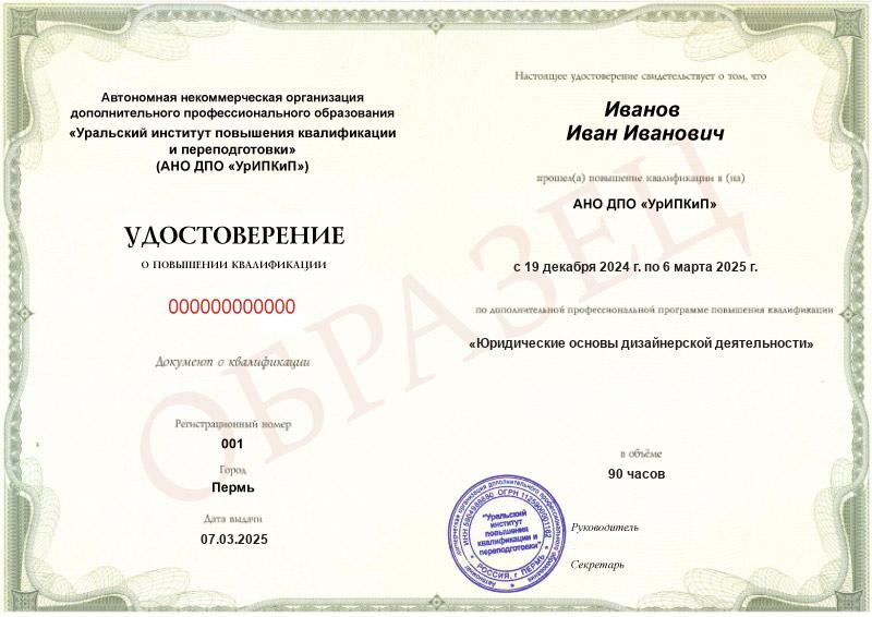 Да, дипломы и удостоверения оформляются в соответствии с действующим законодательством РФ. Документы печатаются на специальных бланках, заверяются печатью АНО ДПО «УрИПКиП».